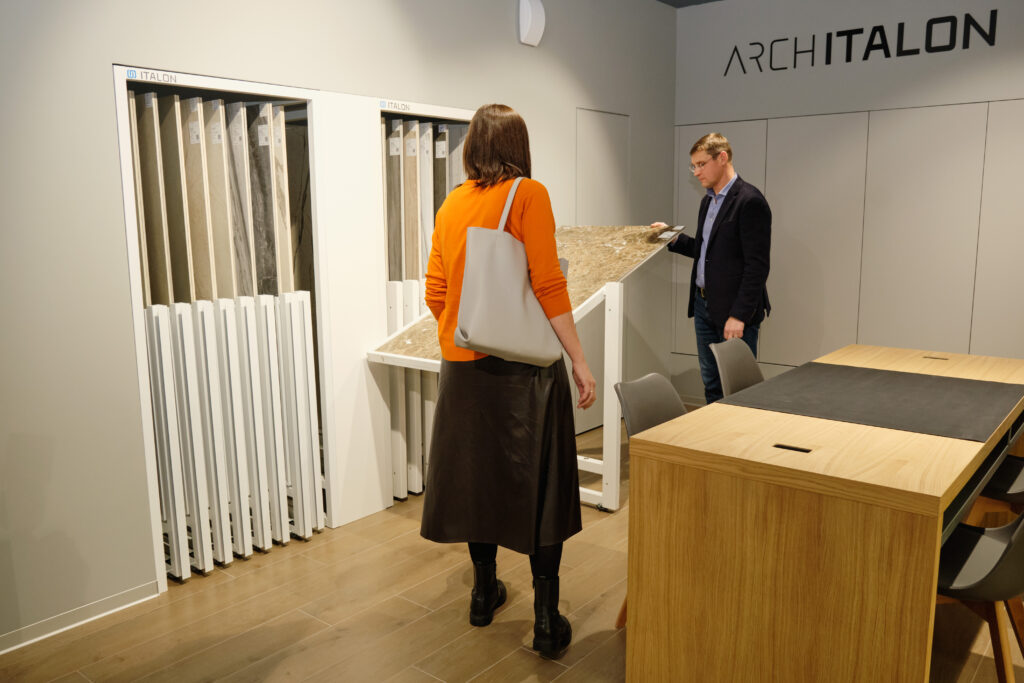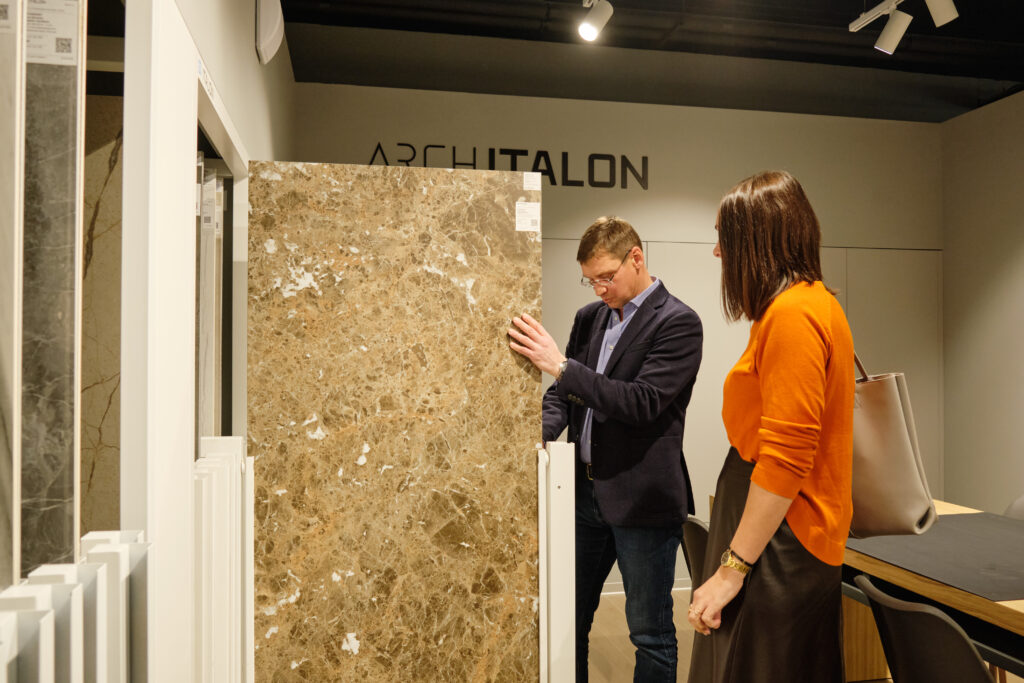 В салоне представлена не только стандартная гамма, но и утолщенный уличный керамогранит Italon X2, плиты макси-формата 120х278, а также мебель и сантехника из керамогранита Italon Home.